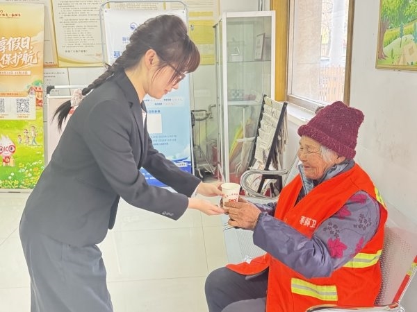 针对户外工作者,人保财险衡水枣强支公司于营业厅内专门开辟“环卫工人便民休息区”,配备座椅、饮用水等,为环卫工人提供遮风挡雨、歇脚休息的便利空间,传递对基层工作者的尊重与关怀。近日在甲流高发期间,营业厅还免费提供口罩、消毒湿巾等防护用品,并持续供应温热水,做好日常消毒,筑牢健康防护线。