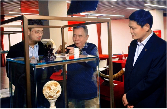 李春珂大师、周天意董事长、保利中国工艺领导张金鸽鉴赏牙雕作品